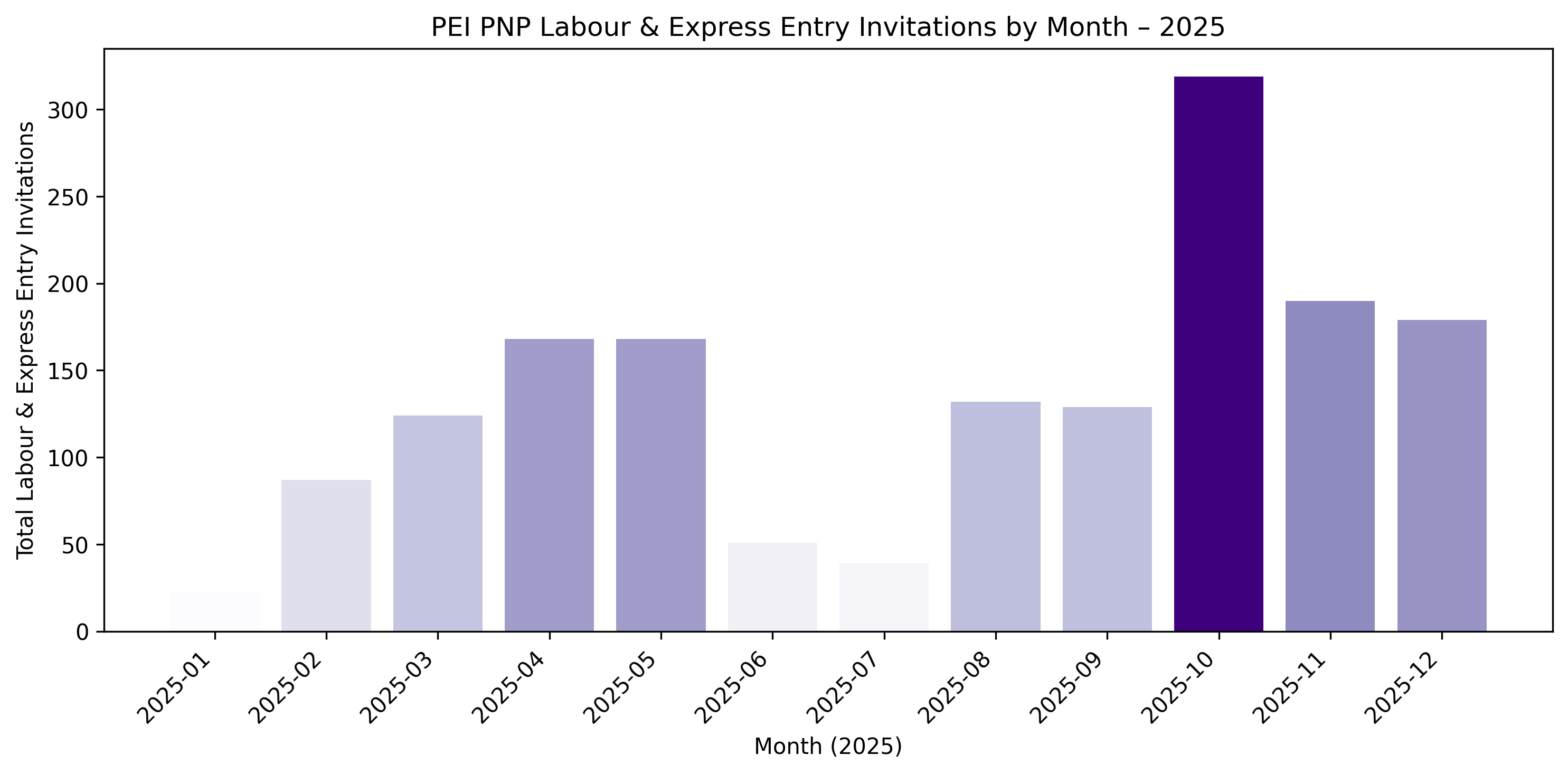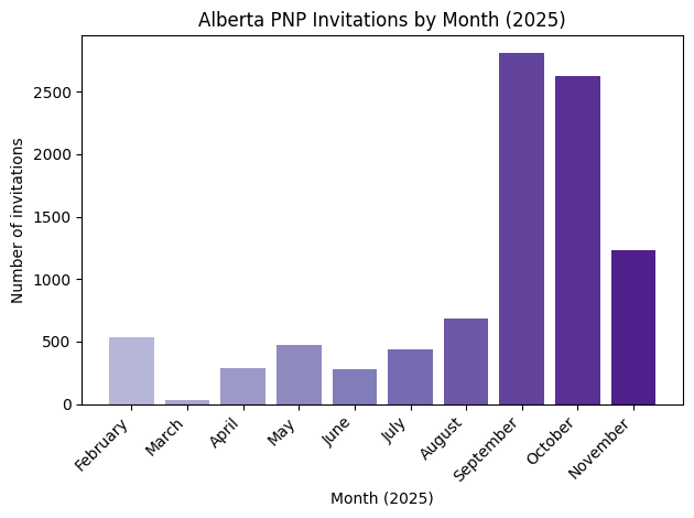 Draw activity was fairly consistent in Alberta throughout 2025, though invitation numbers did trend higher later in the year. September and October stand out as months with large draws.