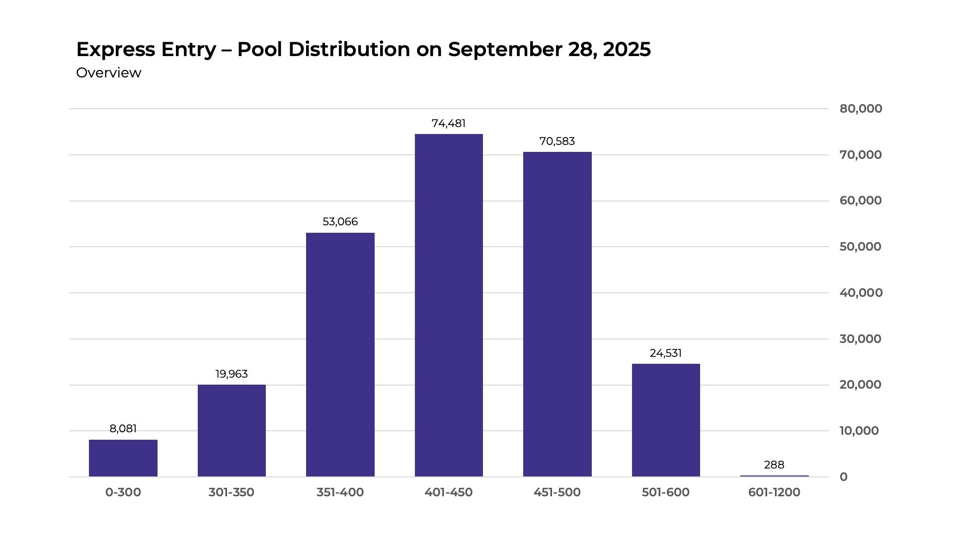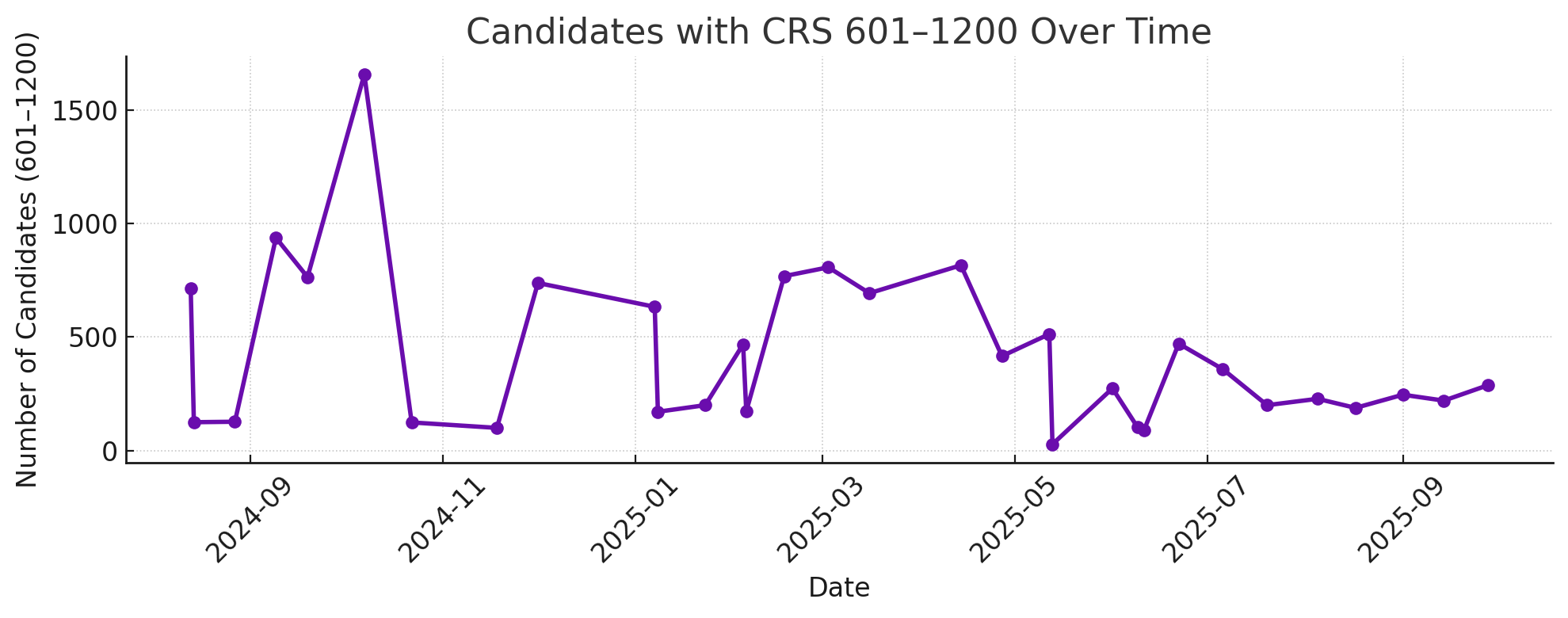 The glimpse into the Express Entry pool for early October actually came from Sunday, September 28, 2025. Given that we typically see an influx of candidates at the 501+ range on the first of each month, when IRCC’s system automatically credits the extra month of Canadian work experience, the data may actually be slightly off-base for October. We’ll do a further update when we get the next glimpse into the pool.