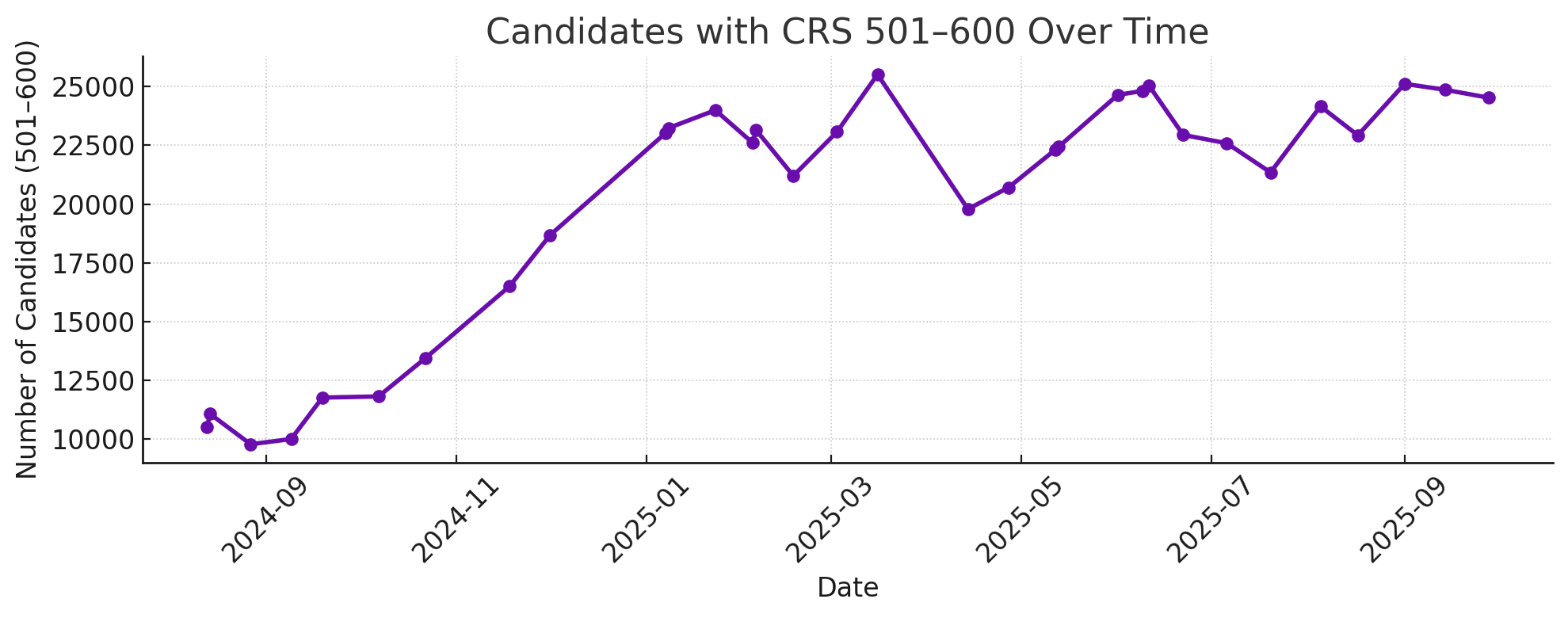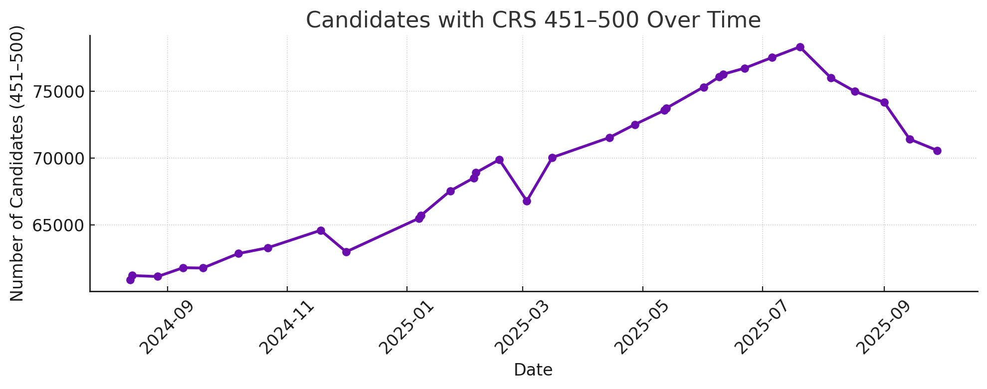 The 451–500 band weakened through September: 74,183 on Sept 1 → 71,427 on Sept 14 → 70,583 on Sept 28 (net −3,600 from Sept 1). This is quite interesting, since we saw a number of category-based draws with a CRS cut-off in that range.