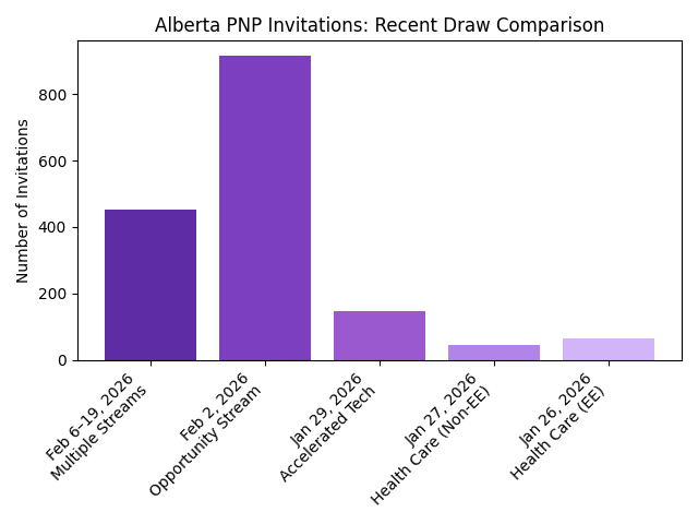 In terms of size, the February 6–19 set of draws (451 invitations) was smaller than the February 2 Alberta Opportunity Stream draw (915 invitations). It was larger than the single January 29 Accelerated Tech Pathway draw (148 invitations) and larger than each of the two Dedicated Health Care Pathway draws (43 and 63 invitations).