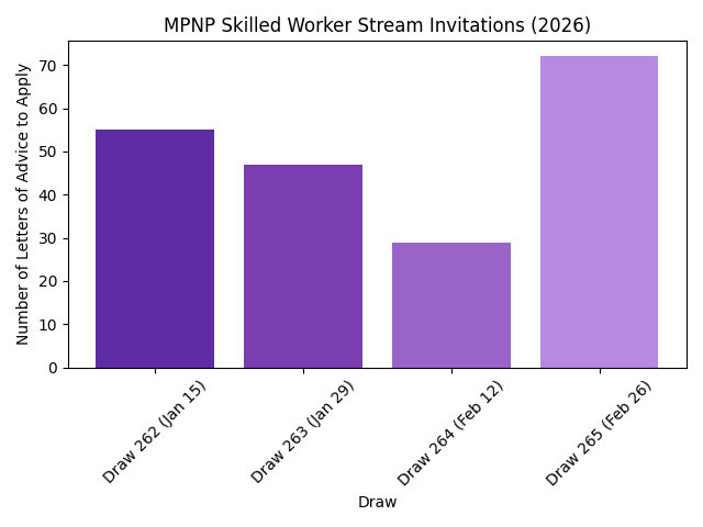 The February 26, 2026 round was the fourth Skilled Worker Stream draw of the year. A total of 72 Letters of Advice to Apply were issued in Draw #265.