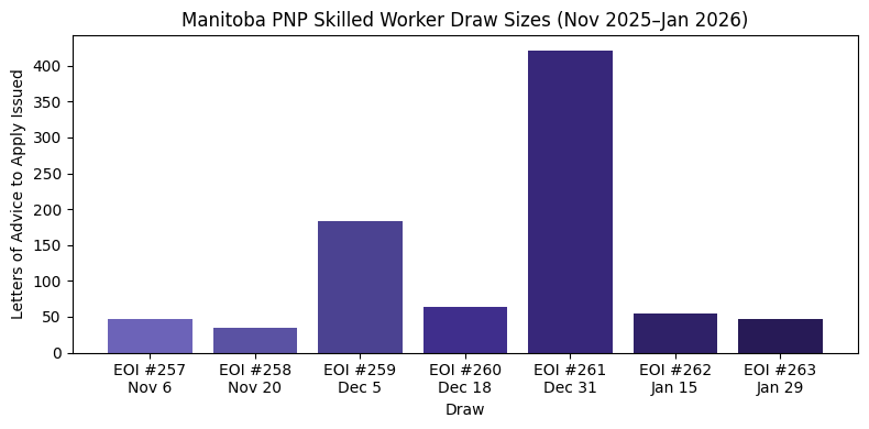 The most recent Manitoba Provincial Nominee Program draw issued 47 Letters of Advice to Apply through the Skilled Worker streams. This compares with 55 Letters of Advice to Apply issued in Expression of Interest Draw #262, held on January 15, 2026.